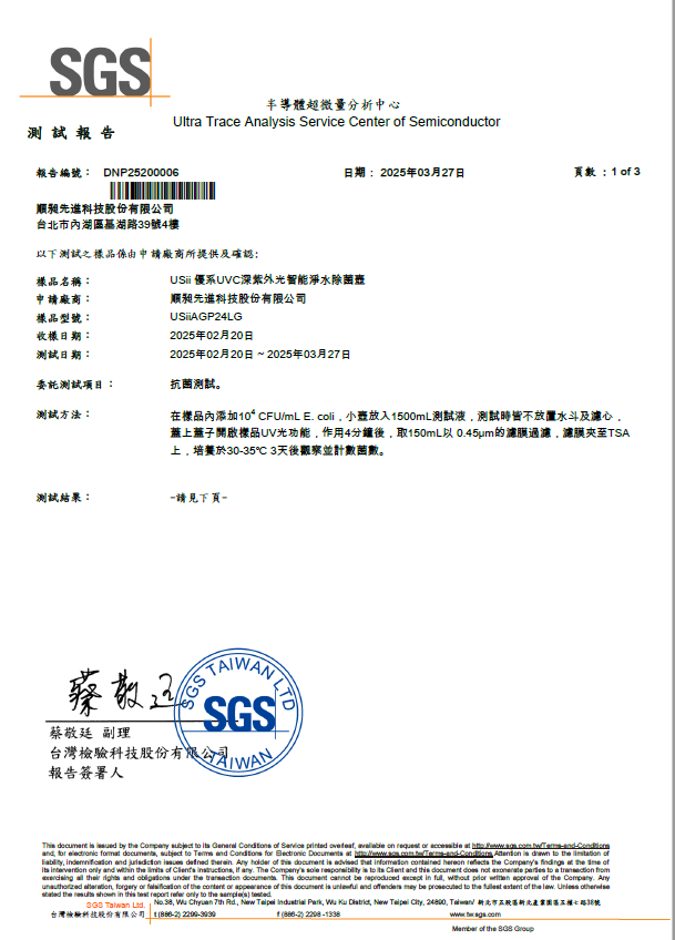 Home 部落格列表 USii UVC 深紫外光智能淨水除菌壺SGS除菌報告_2.4L
