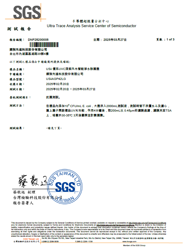 Home 部落格列表 USii UVC 深紫外光智能淨水除菌壺SGS除菌報告_4.2L