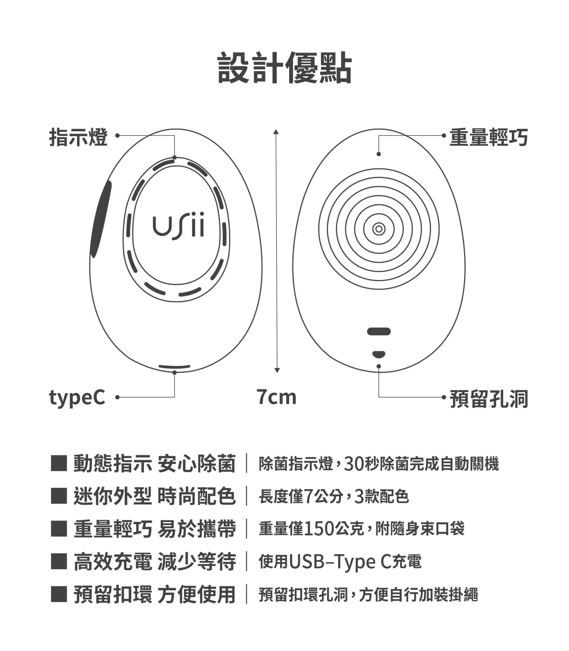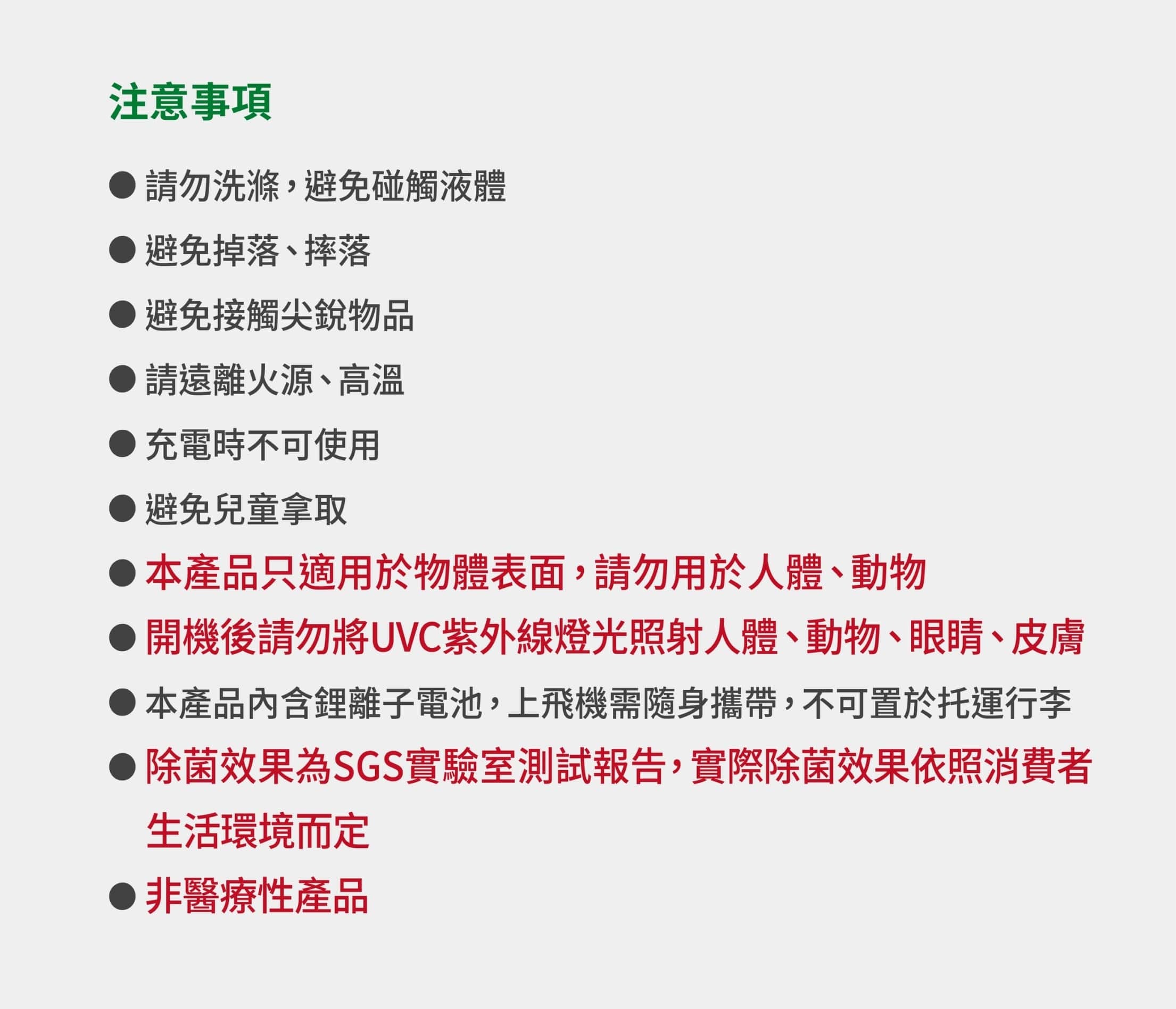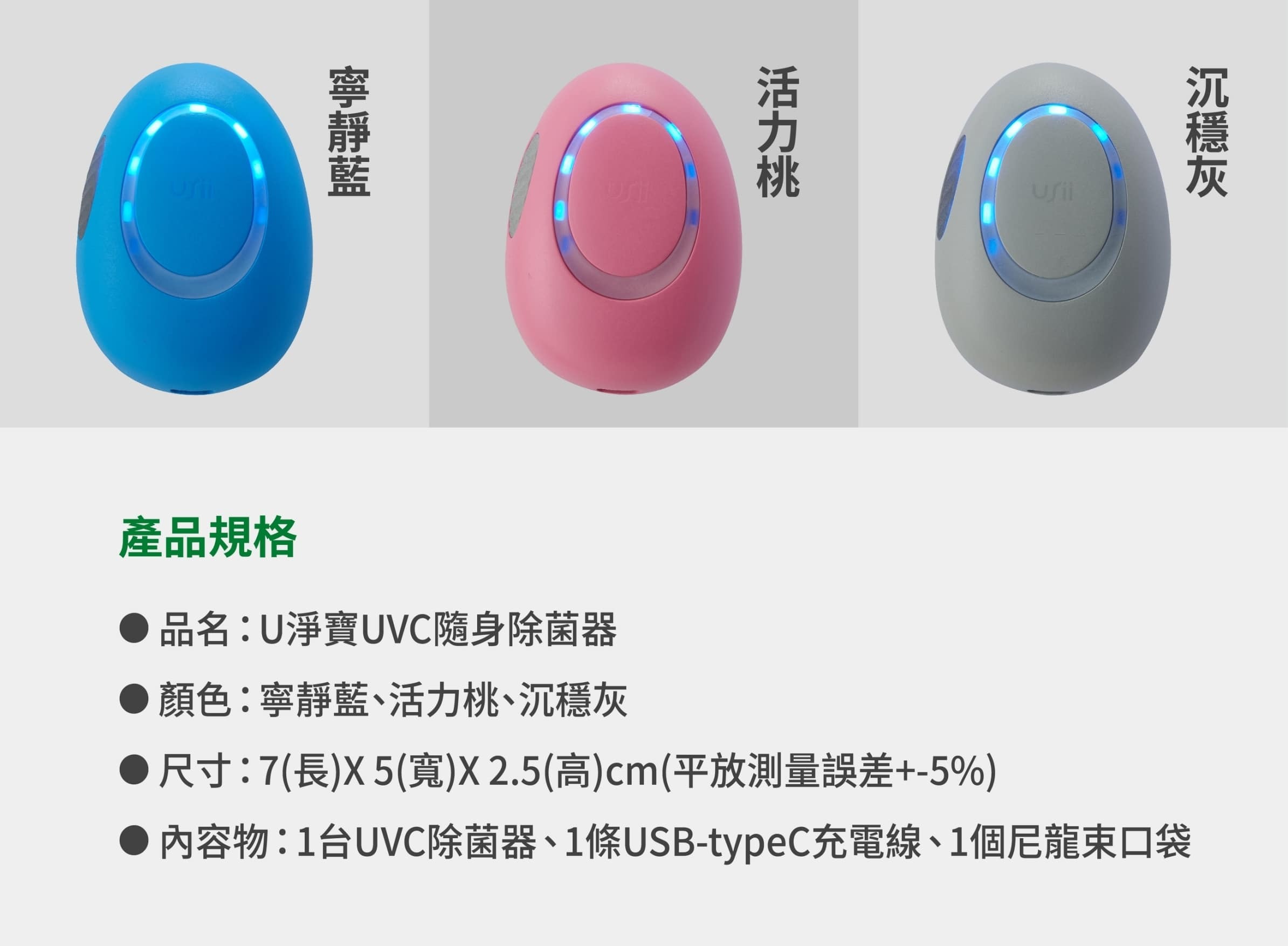 ・ 內容物:1 台 UVC 隨身除菌器、1 條 USB-TYPE C 充電線、1 個隨身收納袋、說明書與服務卡